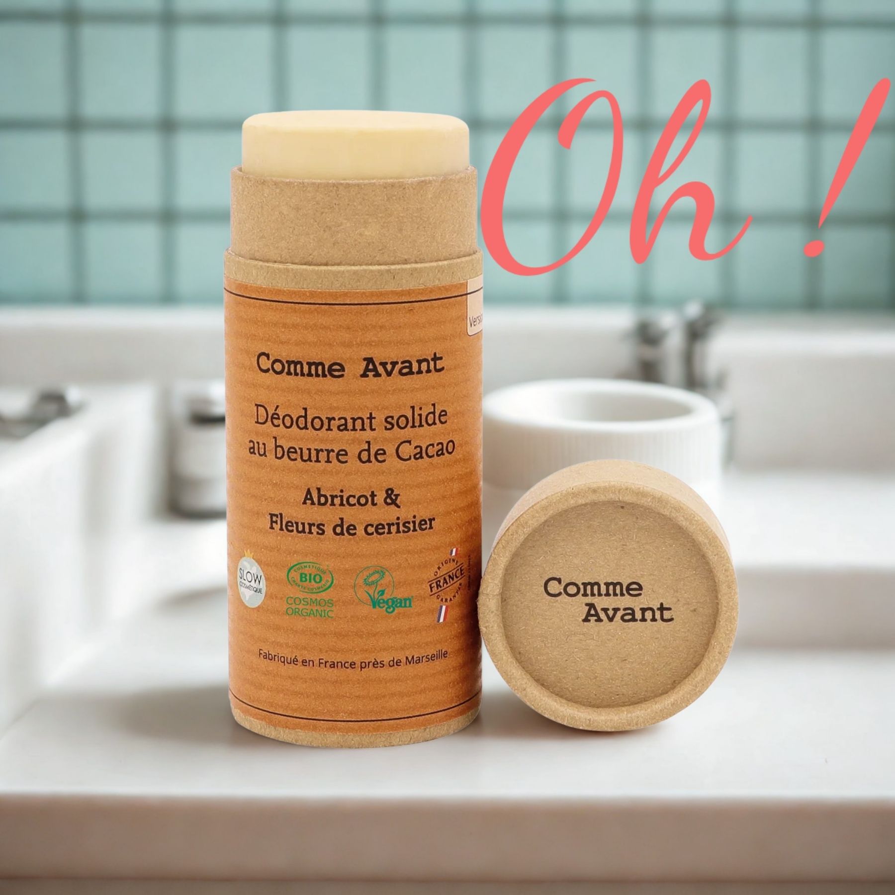 Oh ! C’est chouette !! Le déodorant solide naturel Abricot & Fleurs de Cerisier t’apporte fraîcheur, douceur et efficacité longue durée : sans compromis sur la planète 🌿